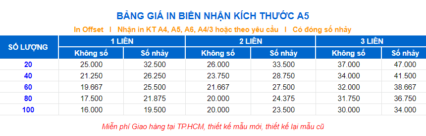 Bảng giá in giấy biên nhận tại In Hoàng Anh